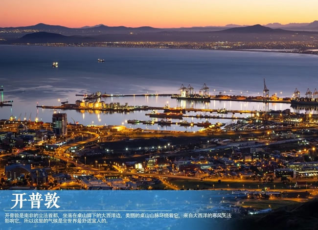 【開普敦】是歐裔白人在南非建立的第一座城市,這座南非白人心中的母城三百余年來數度易主,歷經荷、英、德、法等歐洲諸國的統(tǒng)治及殖民,雖然地處非洲,但卻充滿多元歐洲殖民地文化色彩。開普敦集歐洲和非洲人文、自然景觀特色于一身,因此名列世界最美麗的都市之一,也是南非最受歡迎的觀光都市。