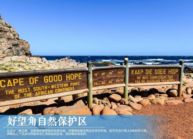 【好望角】于開普半島南端,在保護區(qū)內,鐵銹色凹凸不平的地面上生長著一片片低矮的灌木叢和被稱為南非國花的山龍眼,狒狒、非洲旋角大羚羊等動物間或在眼前一躍而過。在大西洋邊紅色的卵石灘上,時常可見駝鳥閑庭信步的可愛模樣。在保護區(qū)的西南端有一個如同伸入大西洋中巨大鱷魚爪的岬角。