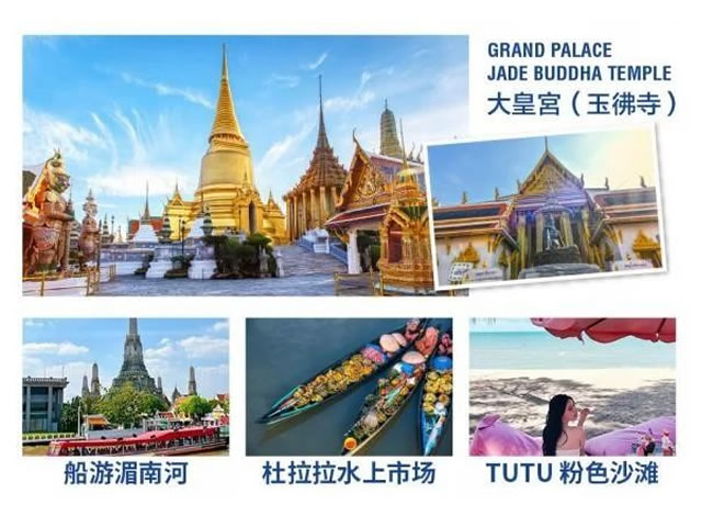 1.【大皇宮 +玉佛寺】早餐后,前往泰國標志建筑【大皇宮】,是泰國歷代王宮保存最完美、規(guī)模最大、最有民族特色的王官,被稱為“泰國藝術大全 ” ,與大皇宮相鄰,是全泰國唯一沒有僧侶住持的佛寺,供奉著一座價值連城的國寶---玉佛 ,是泰國的三大國寶之一。2.【長尾船游湄南河】乘坐泰國獨有的長尾船,暢游在湄南河中。既可以欣賞水上人家又可以放松心情,又可以欣賞到曼谷獨有的湄南河景色、鄭王廟 。河岸兩邊的景色和風光一定會給您帶來不一樣的體驗。3. 【廊1919】曼谷新晉潮人打卡低,是由必沙布家族里的高官波山舒巴本先生 1850 年型建的 。那時是火船運輸最 鼎盛的時期,船只往來川流不息?;鸫瘸俗鳛榇a頭之外,還建有一座媽祖廟,以便出海的船員和附近的居民祭拜。1900 年期間,這里逐漸改為辦公室、住家和倉庫。員工宿舍在樓上,樓下則為辦公室 。在這期間,這里也曾作為中 國商人協(xié)會的中心,對華人商業(yè)發(fā)展起了積極的推動作用。4.【國際人妖秀】 (游覽時間不少于 60 分鐘) ,欣賞佳麗名媛們傾情奉獻給大家 的精湛演繹,陶醉于紅袖飄舞、婀娜 多姿、千嬌百媚的藝術神韻而會感嘆她們的百變神奇。溫馨提示 : 參觀大皇宮玉佛寺時男士須穿長褲,女士需穿過膝長裙,女士不可穿露背、吊帶上衣及超短裙。